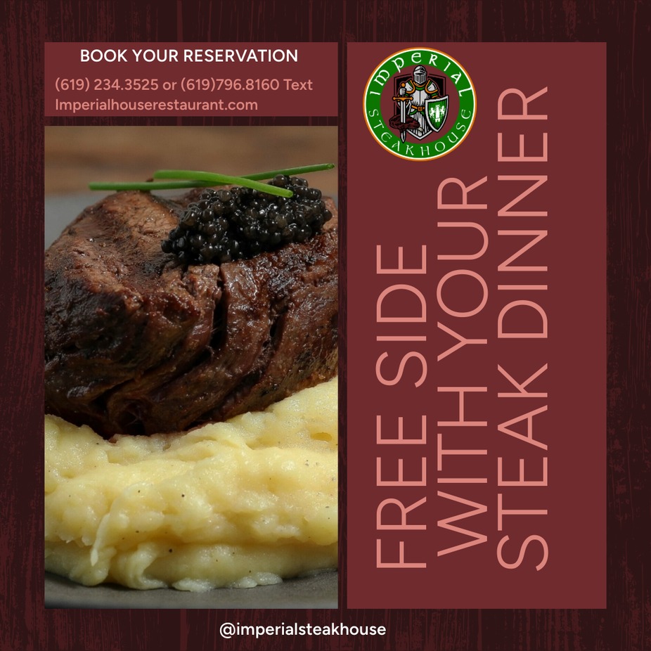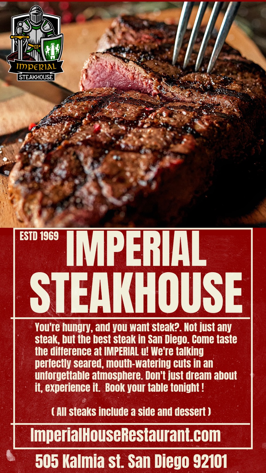For over half a century, Imperial Steak House has been serving generations of San Diegans with quality meals and memorable experiences. Located across from historic Balboa Park on Kalmia Street, we invite you to come savor not just our steaks, but the wide variety of dishes that make Imperial Steak House a true neighborhood treasure.